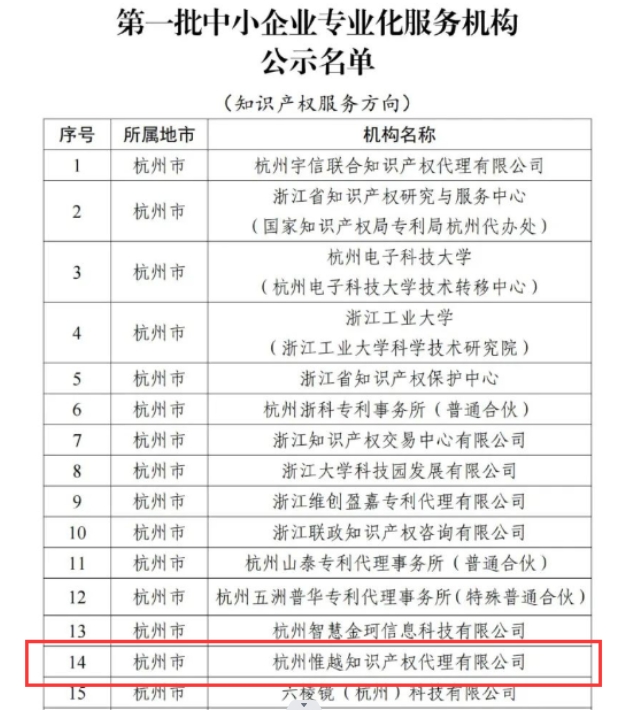 喜報??!關于杭州惟越知識產權代理有限公司入選浙江省首批中小企業專業化服務機構的公示